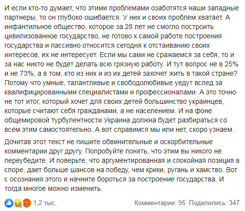 По его словам, российские деньги это серьезная угроза. Огромные вливания будут позитивными для экономики, но по факту разрушителями для построения молодого проевропейского независимого государства. И тогда о евроинтеграции можно будет забыть. Право на свободу и самоопределение придется отложить в темный ящик. До лучших времен. А детей в школах будут учить по учебникам, которые напишут под патронатом Кремля. В них будет про "переворот майданутых", про хунту, националистов и распятых мальчиков в трусиках.