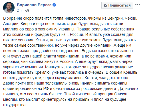 "В Украине скоро появится толпа инвесторов. Фирмы из Венгрии, Чехии, Австрии, Кипра и еще нескольких стран будут вкладывать сотни миллионов евро в экономику Украины. Правда реальные собственник этих компаний и фондов будут из... России. И власть уже создает для них все условия. Кстати, деньги в украинскую землю будут вкладывать те же самые собственники, но уже через другие компании. А еще им поможет закон про двойное гражданство. Ведь согласно этого закона они будут для нашей власти украинцами, а не венграми, чехами или сербами, чьи хозяева живут в России", - написал Береза.
