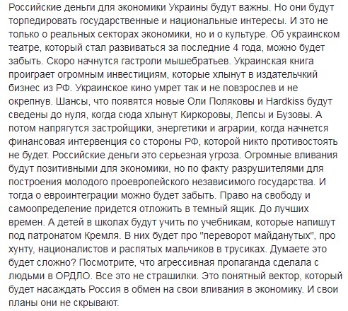 "Об украинском театре, который стал развиваться за последние 4 года, можно будет забыть. Скоро начнутся гастроли мышебратьев. Украинская книга проиграет огромным инвестициям, которые хлынут в издательский бизнес из РФ. Украинское кино умрет так и не повзрослев и не окрепнув. Шансы, что появятся новые Оли Поляковы и Hardkiss будут сведены до нуля, когда сюда хлынут Киркоровы, Лепсы и Бузовы. А потом напрягутся застройщики, энергетики и аграрии, когда начнется финансовая интервенция со стороны РФ, которой никто противостоять не будет", - написал Береза.