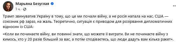 "Трамп обвинил Украину в том, что это мы начали войну, а не россия напала на нас. США - союзник России сейчас, к сожалению. Теоретически, ситуация является поводом для расторжения дипломатических отношений с США", - написала Безуглая.