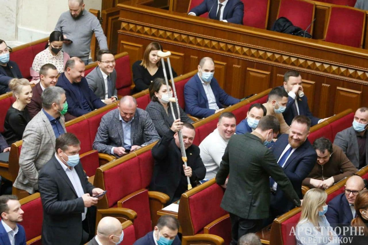 Бужанский продемонстрировал костыль коллегам и журналистам - часть депутатов не скрывала улыбки на своих лицах. Причина, по которой нардеп пришел с костылем, в настоящий момент неизвестна.