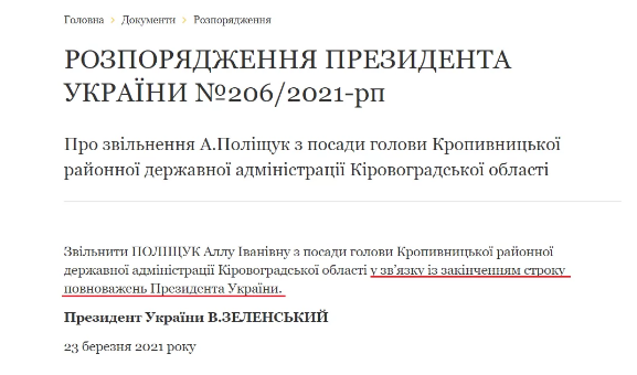 Во вторник, 23 марта, на официальном сайте президента Украины было опубликовано распоряжение Владимира Зеленского об увольнении Аллы Полищук с должности главы Кропивницкой районной государственной администрации Кировоградской области в связи с "окончанием срока полномочий президента Украины".