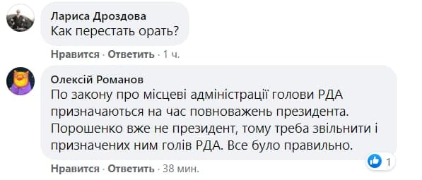 "Расходимся!", "Мы что-то пропустили?", "Как перестать орать?", "По закону о местных администрациях председатели РГА назначаются на время полномочий президента. Порошенко уже не президент, поэтому надо освободить и назначенных им председателей РГА. Все было правильно", - пишут комментаторы.