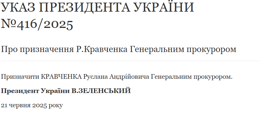 "Указ президента Украины №416/2025 о назначении Р.Кравченко Генеральным прокурором: назначить Кравченко Руслана Андреевича Генеральным прокурором", – говорится в документе.
