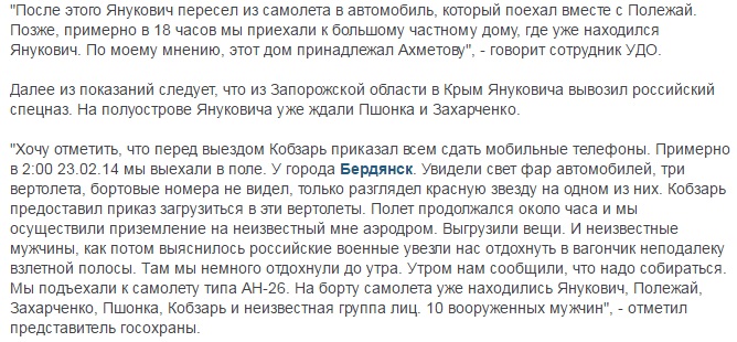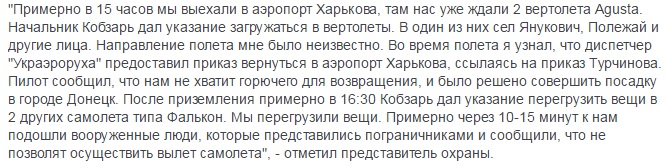 Отмечается, что из Киева Янукович вылетел на вертолете. Для отвлечения внимания в Харьков выехал президентский автомобильный кортеж. Один из сотрудников охраны сказал, что 22 февраля 2014 года он увидел Януковича возле здания Харьковской областной государственной администрации.