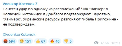 19:15 Российские пропагандисты сообщают, что ВСУ нанесли удар по одному из расположений ЧВК "Вагнер" в Попасной.