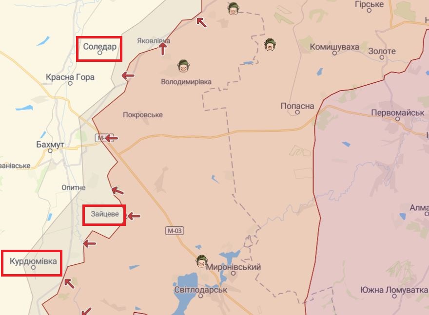 на Бахмутском направлении – Соледар, Бахмут, Бахмутское, Одрадовка, Зайцево, Опытное, Яковлевка, Нью-Йорк, Майорск, Нелиповка, Юрьевка, Выемка, Белогоровка, Раздолевка, Спорное, Веселое и Верхнекаменное;