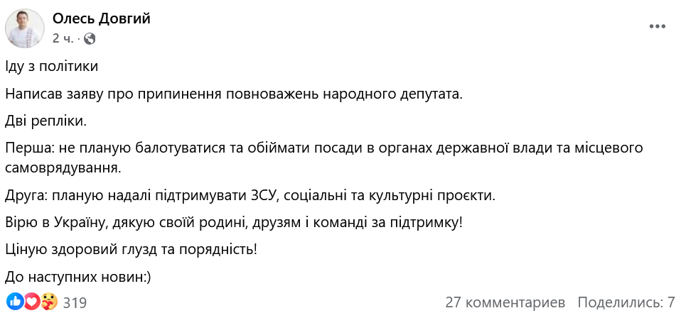 Народный депутат-мажоритарщик Олесь Довгий объявил о решении сложить депутатский мандат и завершении политической карьеры.