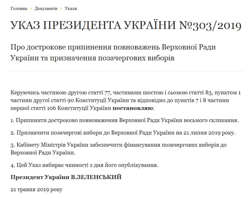 Согласно указу, как и сообщалось ранее, досрочные выборы в Раду назначены на 21 июля.