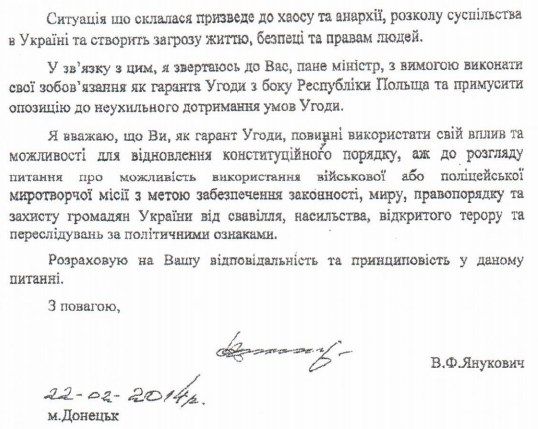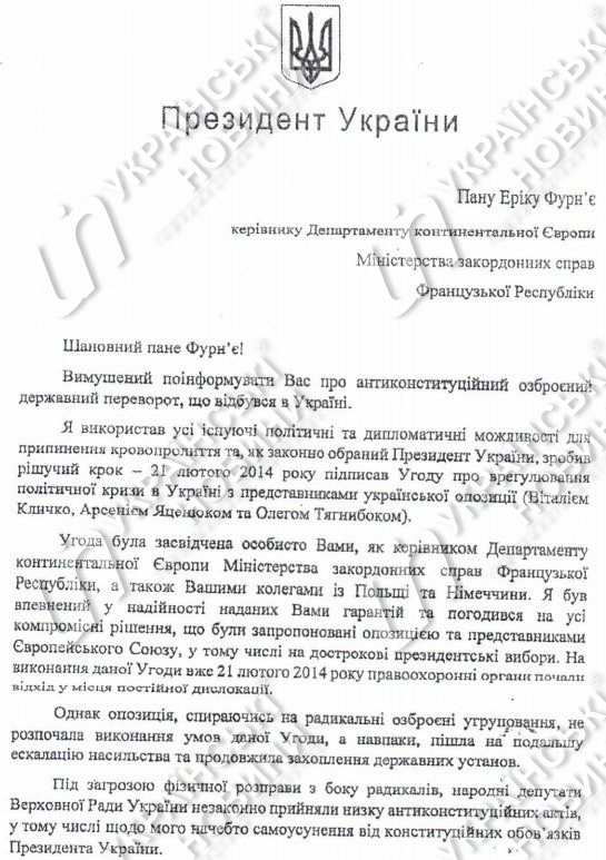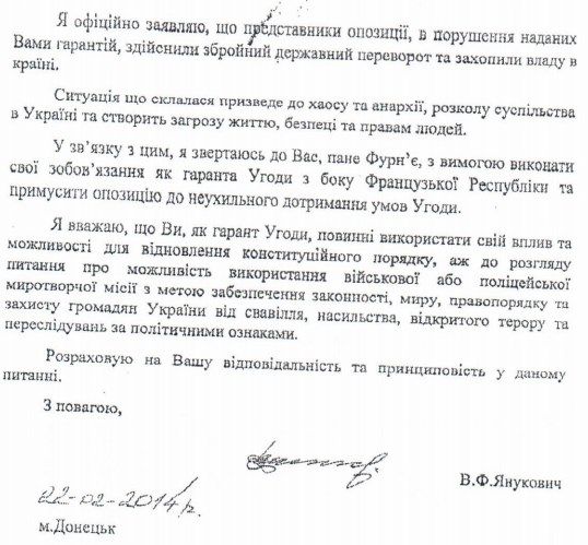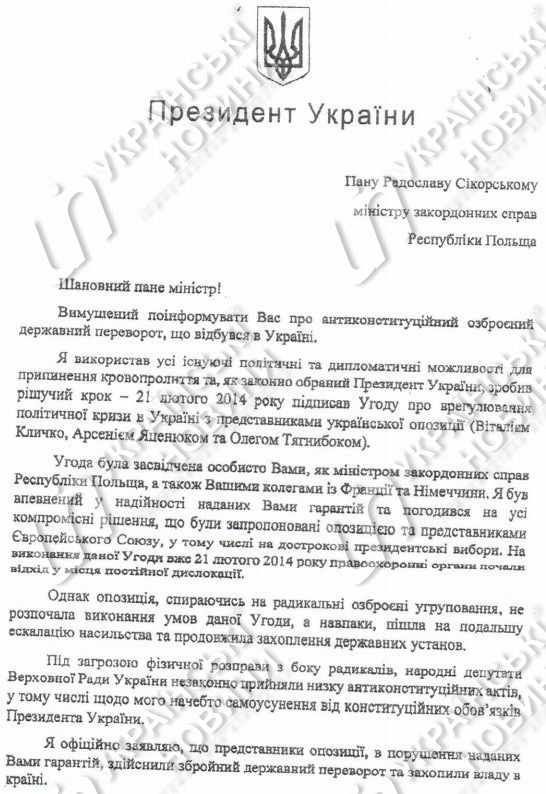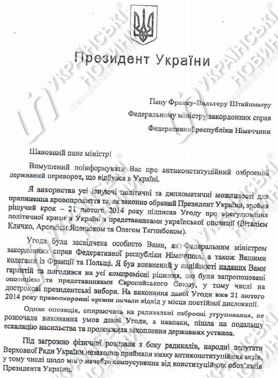 В деле по обвинению экс-президента Виктора Януковича появились его обращения к гарантами выполнения соглашения о мирном урегулировании политического кризиса (министрам иностранных дел Польши, Франции и Германии), датированные февралем 2014 года.