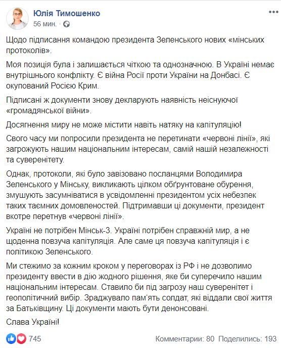 "Моя позиция была и остается четкой и однозначной. В Украине нет внутреннего конфликта. Есть война России против Украины на Донбассе. Есть оккупированный Россией Крым. Подписанные же документы снова декларируют наличие несуществующей "гражданской войны". Достижение мира не может содержать даже намека на капитуляцию!" - отметила Тимошенко