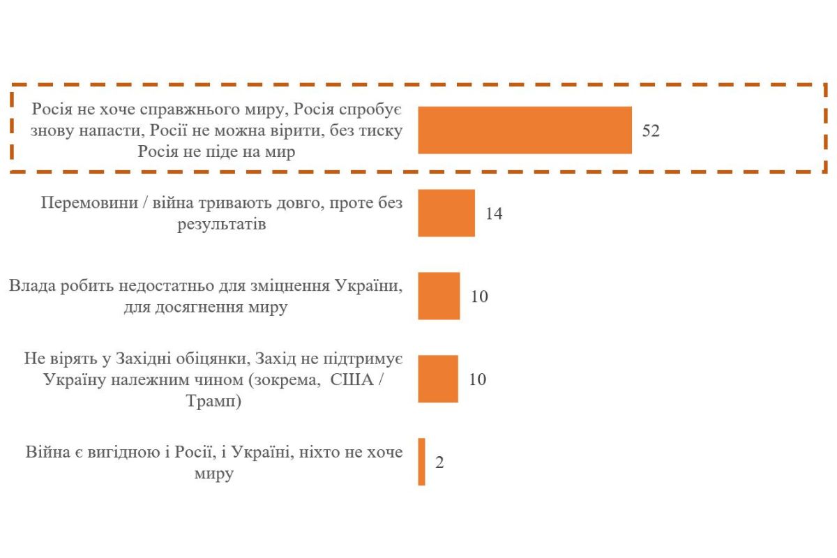 Основной причиной скепсиса 52% опрошенных назвали нежелание России идти на мир и ее планы продолжать войну. Респонденты отмечали, что "цель России — это уничтожение Украины, они не успокоятся", а также отмечали, что "договоренности с Россией, как говорил классик, не стоят бумаги, на которой они написаны". Опрошенные высказывали мнение, что пока у россиян будут оставаться ресурсы, они будут двигаться вперед, а любой мир без развала РФ будет временным.