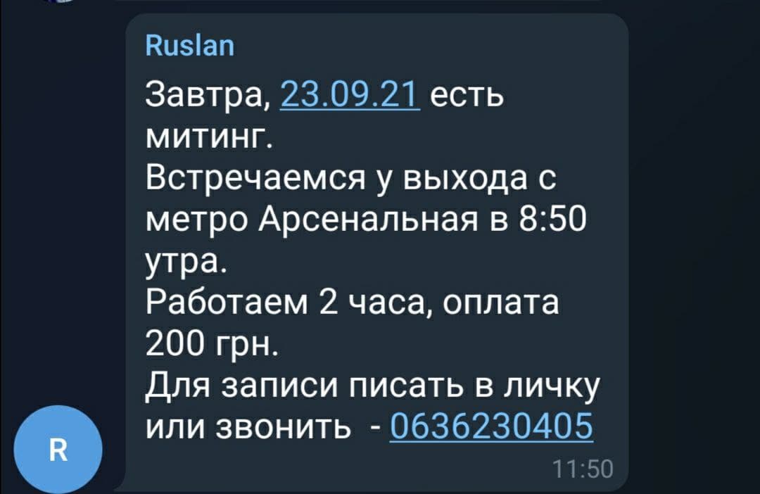 На месте событий журналисты сумели запечатлеть, как молодой человек достает из кармана 400 гривен и дает их двум участникам акции протеста. Он пытается сделать это незаметно в то время, как его коллега записывает, кто из митингующих уже получил деньги.