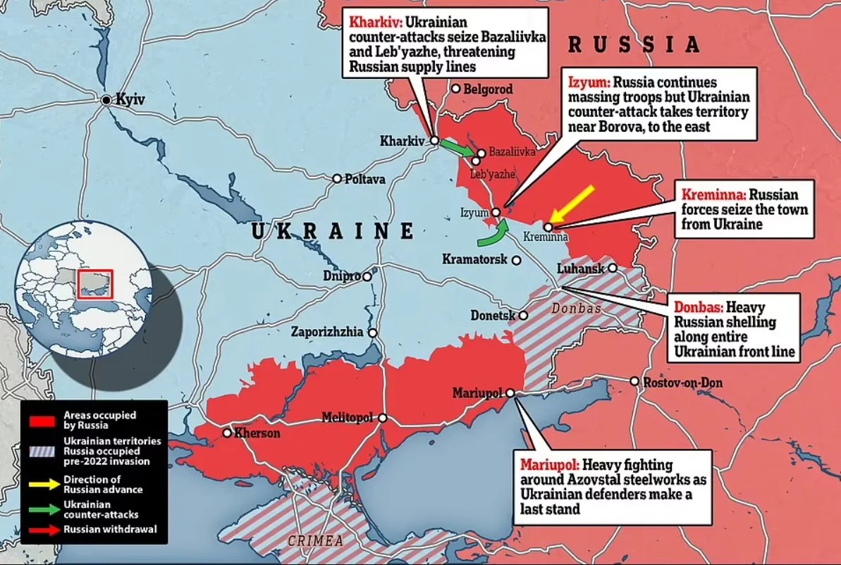 Большая часть ВС РФ сконцентрирована в Изюме в 70 км к югу от Харькова, откуда они намерены продвигаться в направлении Мариуполя.