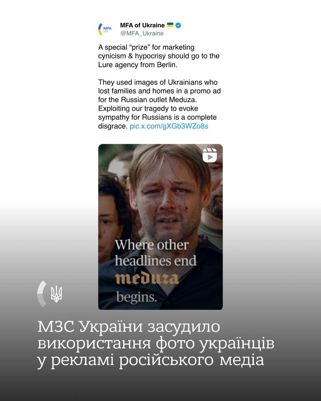 Министерство иностранных дел Украины решительно осуждает демонстрацию изображений украинцев, пострадавших в результате российского террора, в рекламе российского медиа.