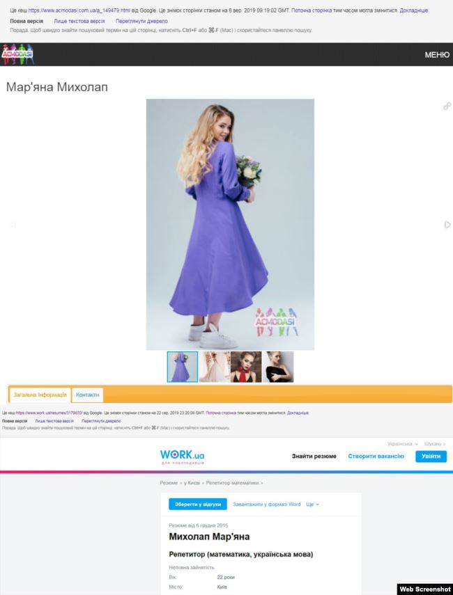 В конце августа ее резюме были удалены. Известно, что в 2017 году Михолап участвовала в отборе на конкурс "Мисс Украина".