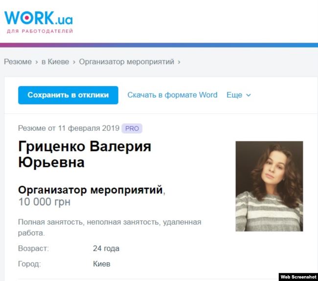 Интересно, что в начале 2019 года Гриценко искала работу организатора массовых мероприятий. Также она предлагала свои услуги как модели.