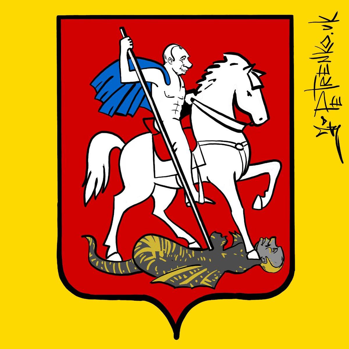 На новой карикатуре Путина изобразили верхом на коне и с орудием в руке, однако убивает российский президент не кого-либо, а самого себя. Интересно, что "вторая версия" российского президента изображена в виде павшего дракона.