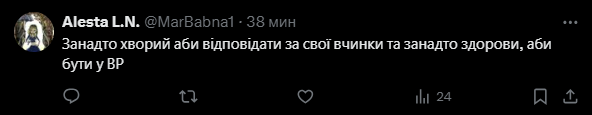 "Такого уровня цинизма еще не было", "Господин Президент, сделайте пожалуйста что-то с этим митболом, потому что общество уже и так на грани, "На нас в очередной раз положили с большой горы", "какой кринж", "неслыханное лицемерие", "Кто-то убегает спокойно из страны, а кто-то на видео извиняется и ему все прощают. А тут можно игнорировать заседание суда. Страна возможностей...", - так комментируют появление Тищенко в раде пользователи соцсетей.