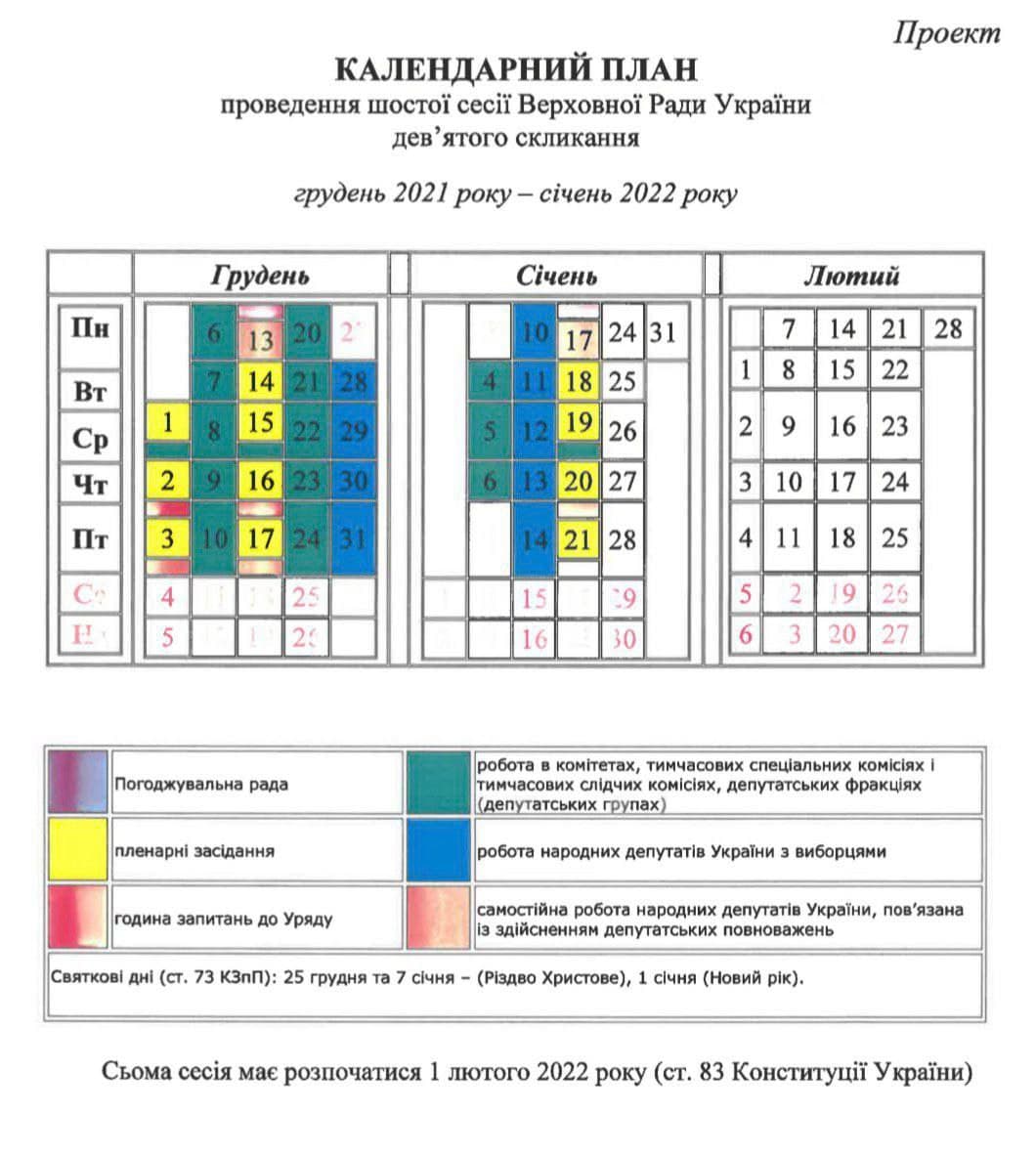 Нардепы поддержали проект постановления № 6381 о внесении изменений в календарный план. Теперь в период с 10 по 14 января 2022 года депутаты будут формально находиться на своих избирательных округах и вести работу с избирателями.