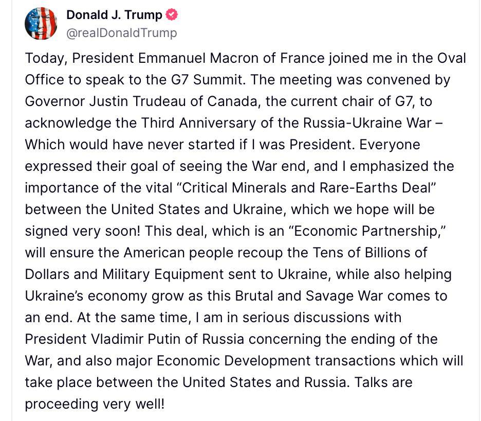 Президент Соединенных Штатов Дональд Трамп заявил, что проводит серьезные переговоры с российским диктатором Владимиром Путиным по поводу завершения войны в Украине и возобновления сотрудничества США и РФ.