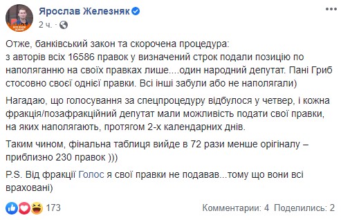 "Все остальные забыли или не настаивали... Таким образом, финальная таблица выйдет в 72 раза меньше оригинала - примерно 230 поправок", - пишет Железняк.