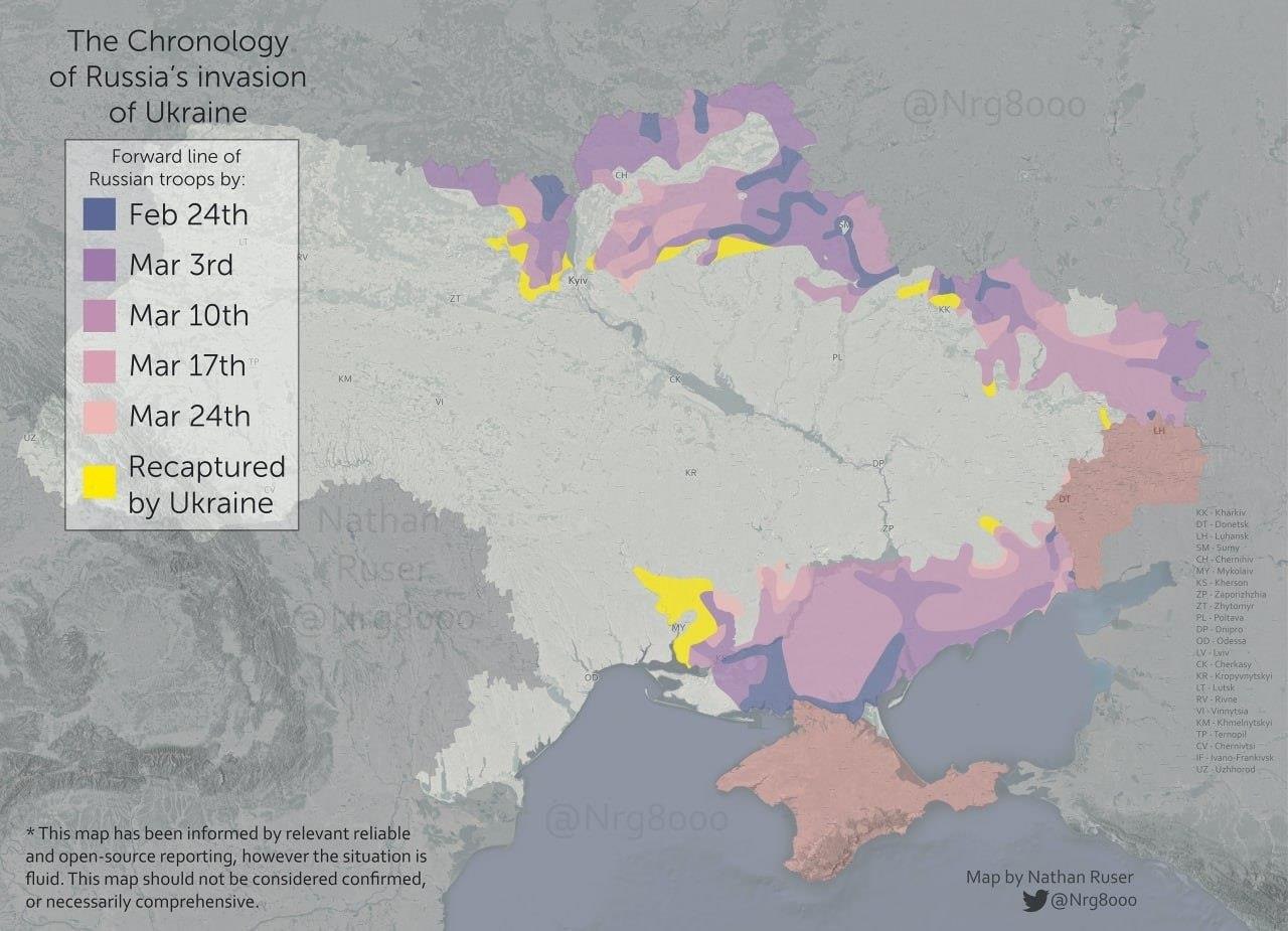 Прошли 29-е сутки противостояния украинского народа российскому вторжению. По состоянию на конец четверга, 24 марта, задачи оккупантов по выходу на админграницы Донецкой и Луганской областей, окружение Киева и установление контроля над Левобережной частью Украины не выполнены. Противнику удалось частично добиться успеха в Донецком операционном районе по содержанию сухопутного коридора между Ростовской областью РФ и оккупированным Крымом.