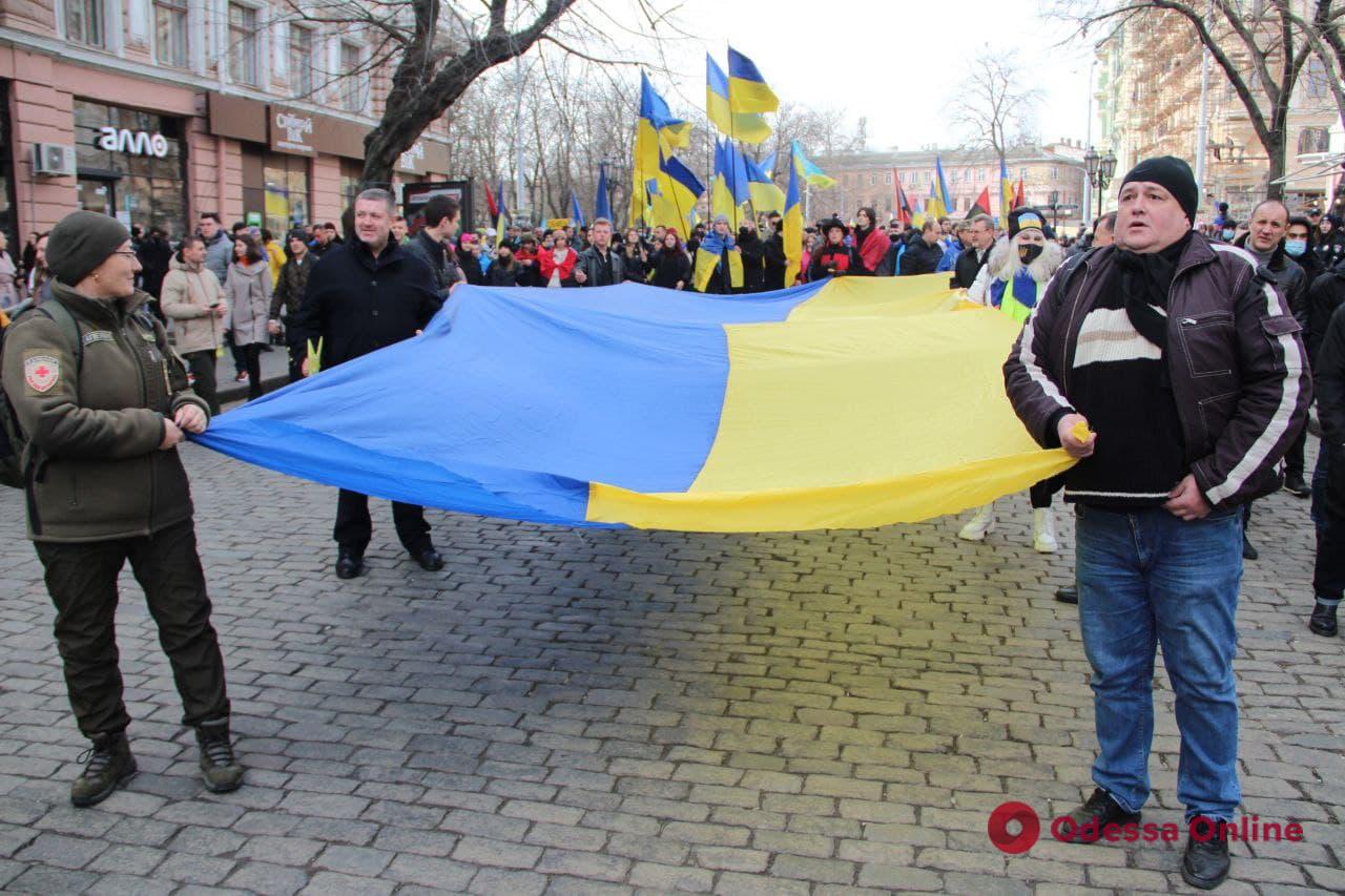 В связи с обострением военно-политической ситуации в Украине тысячи одесситов вышли на "Марш Единения", с целью символично поддержать достоинство и целостность государства, а также продемонстрировать готовность защищать город и страну от нападения.