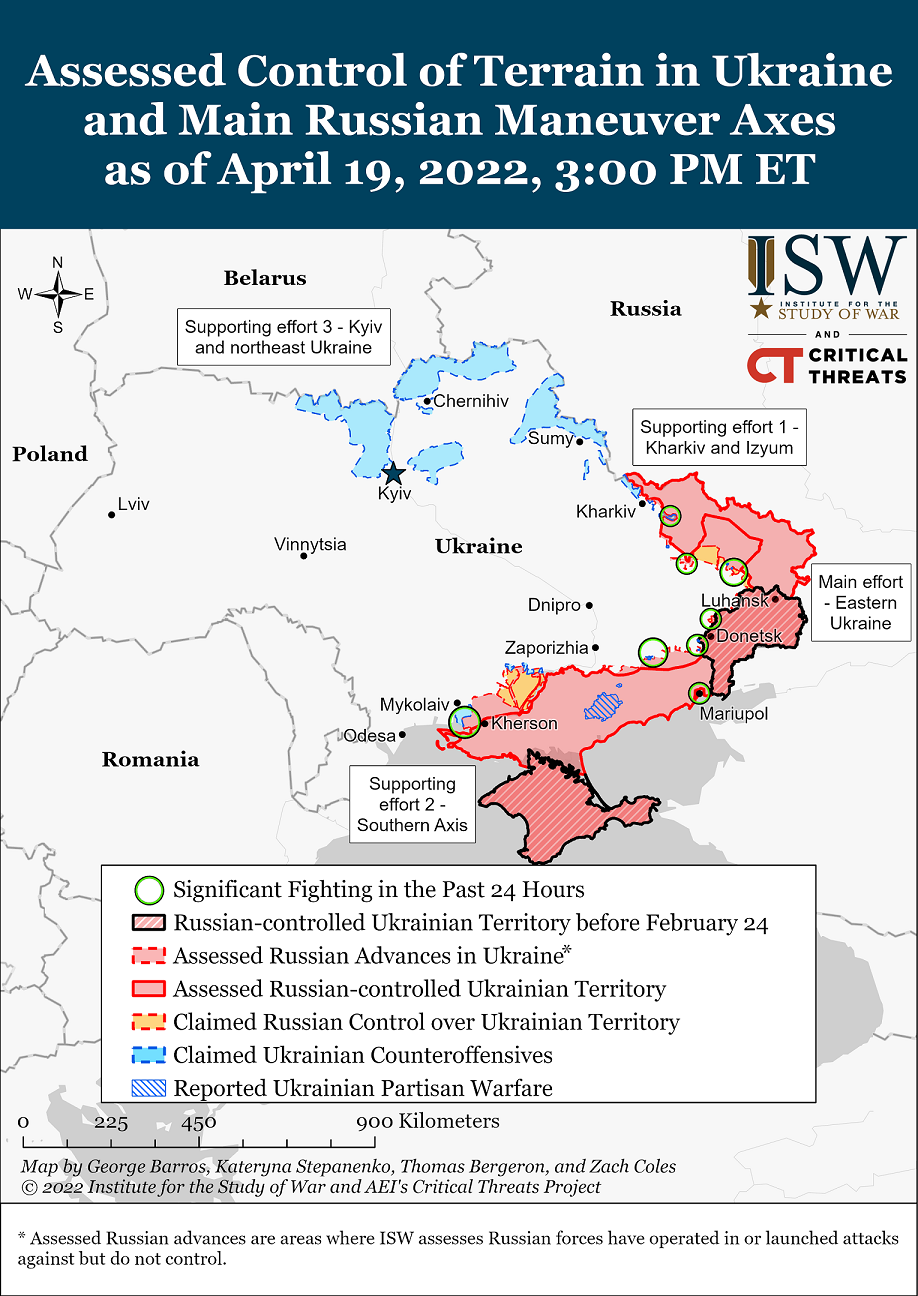 Так, очередная волна вторжения России в Украину началась 19 апреля – российские войска провели интенсивные артиллерийские и воздушные бомбардировки многих участков вдоль линии фронта от Изюма до Николаева, но относительно немного наземных наступательных операций.