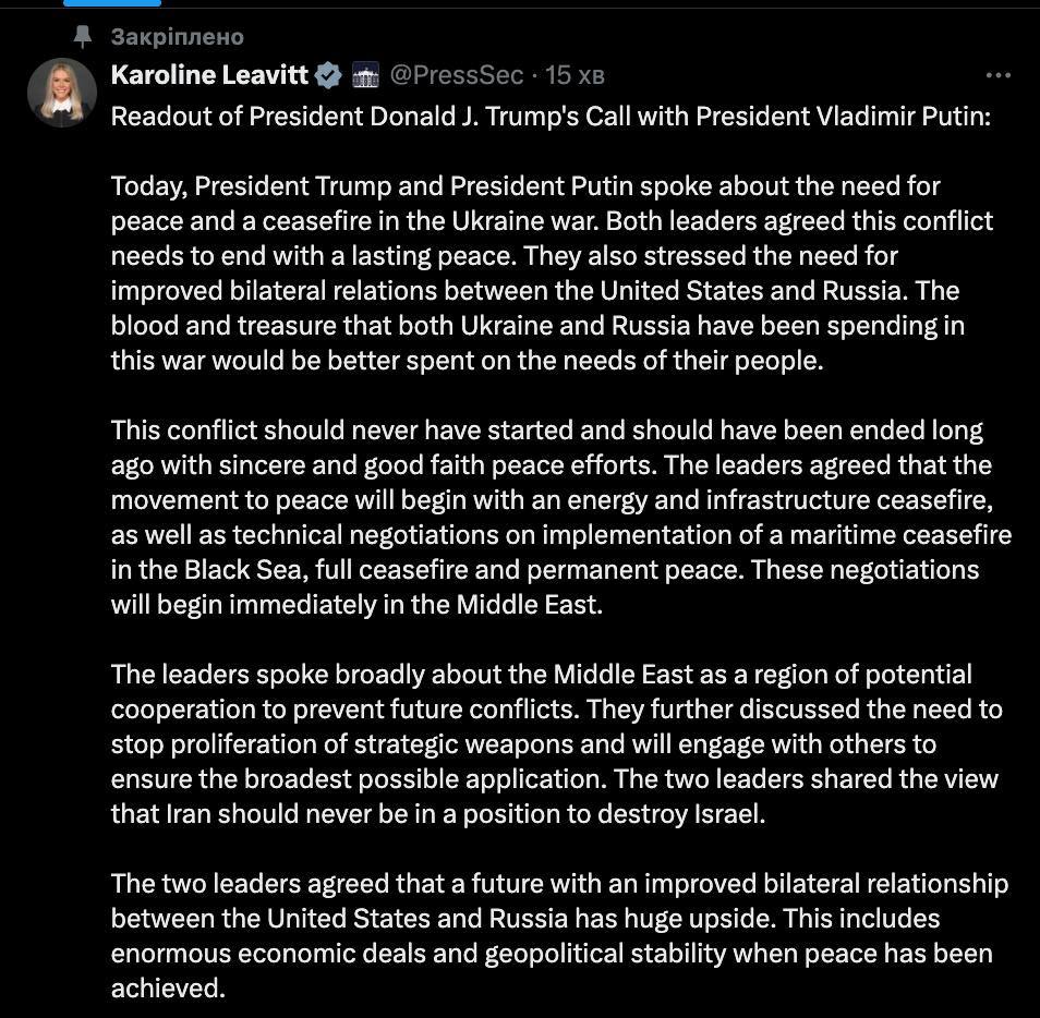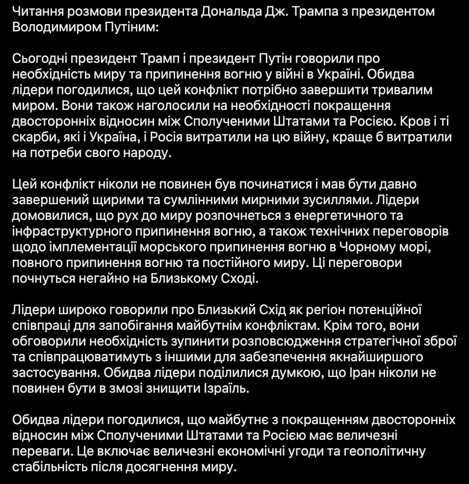 "Трамп и Путин согласились, что конфликт нужно завершить продолжительным миром. Они также подчеркнули необходимость улучшения двусторонних отношений между Соединенными Штатами и Россией. Лидеры договорились, что движение к миру начнется с прекращения ударов по энергетическому и инфраструктурному секторам, а также технических переговоров по имплементации морского прекращения огня в Черном море, полное прекращение огня и постоянного мира".