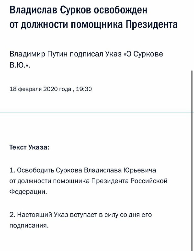 Президент России Владимир Путин освободил Владислава Суркова с должности своего помощника.