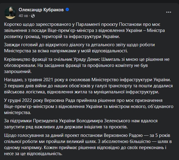 "Кратко относительно зарегистрированного в Парламенте проекта Постановления о моем освобождении от должности Вице-премьер-министра по восстановлению Украины - Министра развития громад, территорий и инфраструктуры Украины. Руководство фракции и глава правительства Денис Шмыгаль со мной это решение не обсуждали. На заседание фракции и профильного комитета не был приглашен. Напомню, с мая 2021 года я возглавлял Министерство инфраструктуры Украины. С первых дней войны к нашим обязанностям в области транспорта и почты добавились военная логистика, восстановление жилья и муниципальной инфраструктуры. В декабре 2022 года Верховная Рада приняла решение о моем назначении Вице-премьер-министром по восстановлению Украины и министром нового, объединенного министерства", - отметил Кубраков