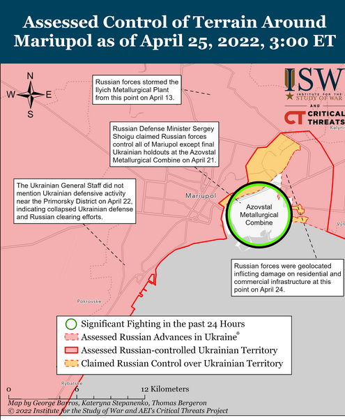 Также 25 апреля российские войска возобновили наземные атаки на мариупольский металлургический завод "Азовсталь", ускорили усилия по обеспечению оккупированного Мариуполя, где, вероятно, столкнутся с широким сопротивлением Украины. Сообщается, что подразделения российской морской пехоты передислоцируются дальше Мариуполя в направлении Волновахи.
