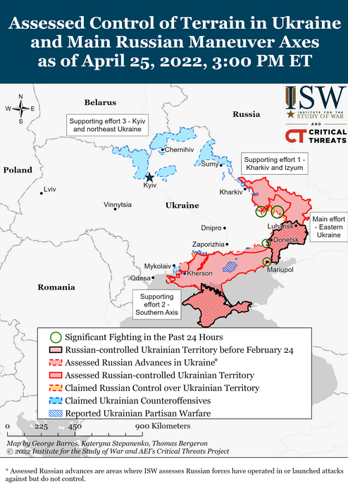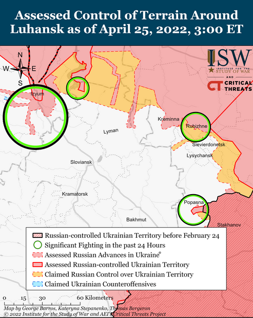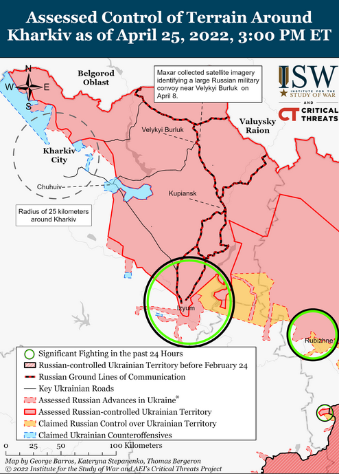 25 апреля продолжали неудачные наземные наступления к югу от Изюма до Барвенкового и Славянска. Российские войска удерживали свои позиции вокруг города Харькова и продолжали артиллерийские и авиационные удары по Харькову и окрестным населенным пунктам.