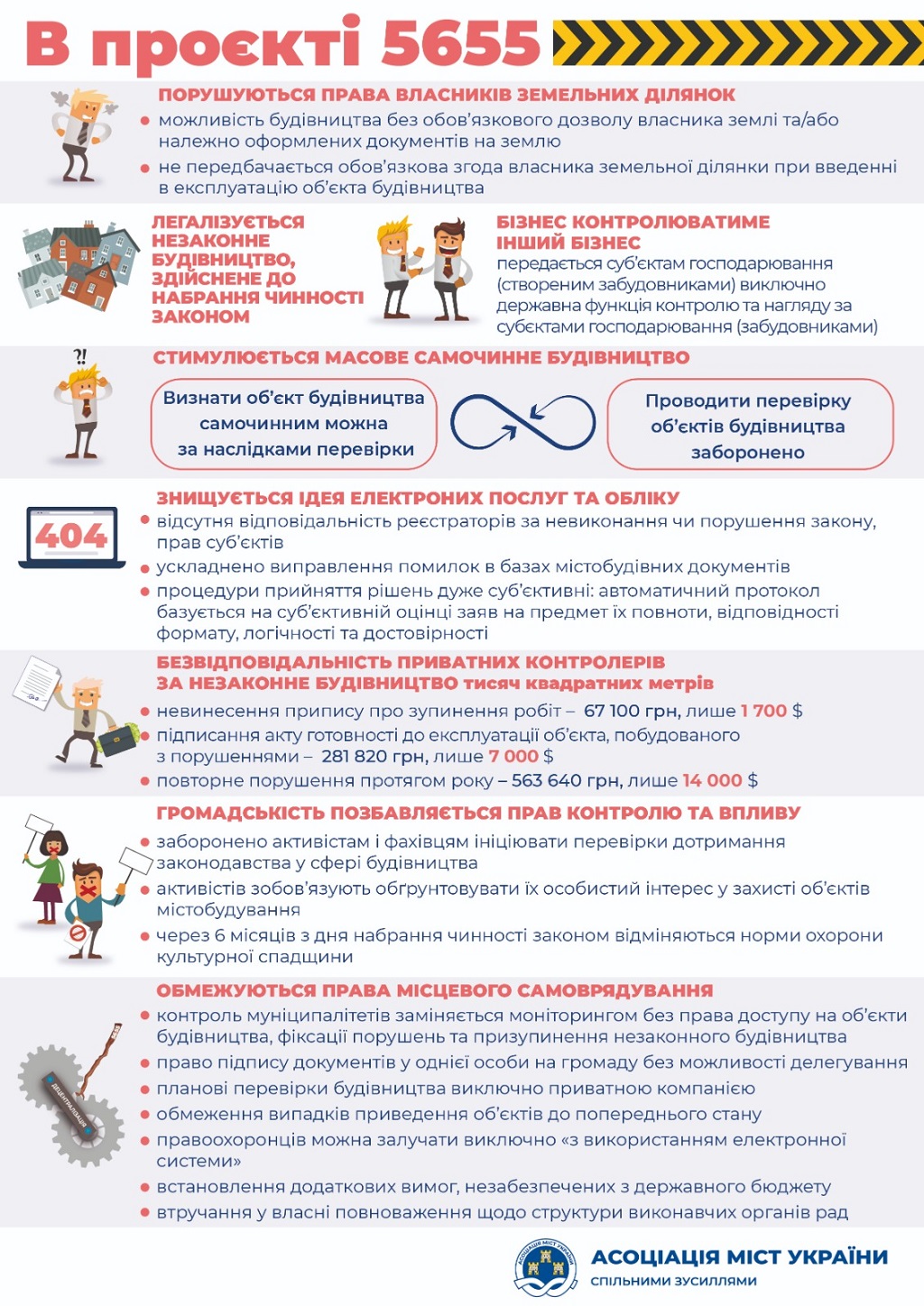 Ассоциация городов Украины обнародовала инфографику, в которой наглядно объясняется, чем вредит законопроект №5655 "о градостроительной реформе" громадам и всему украинскому обществу.