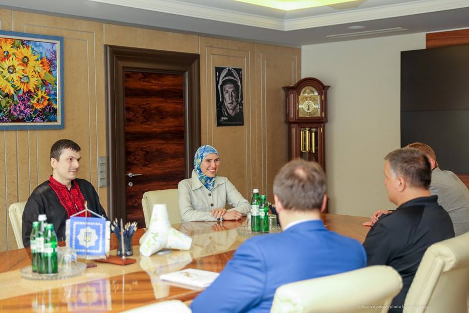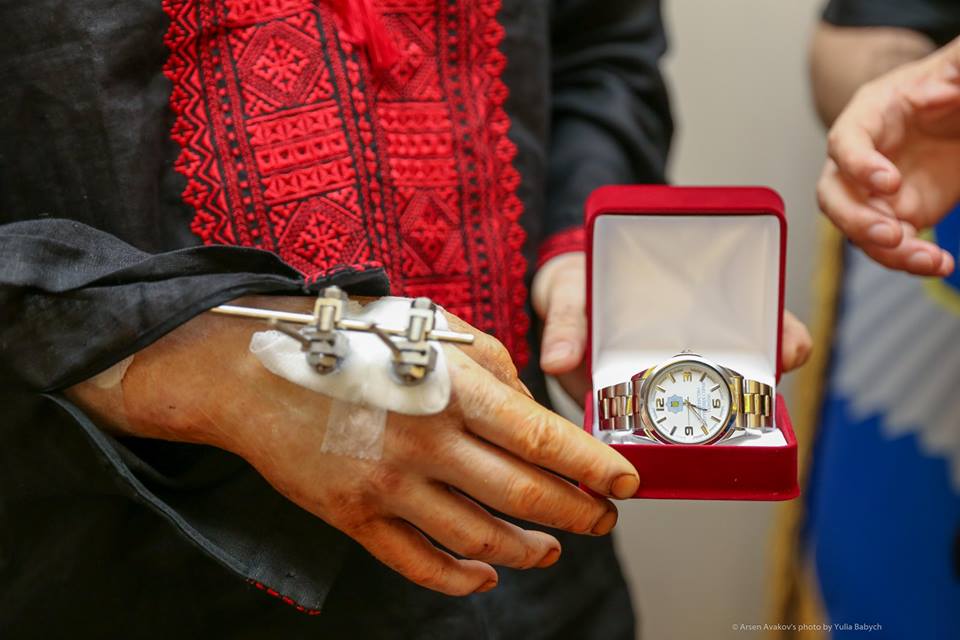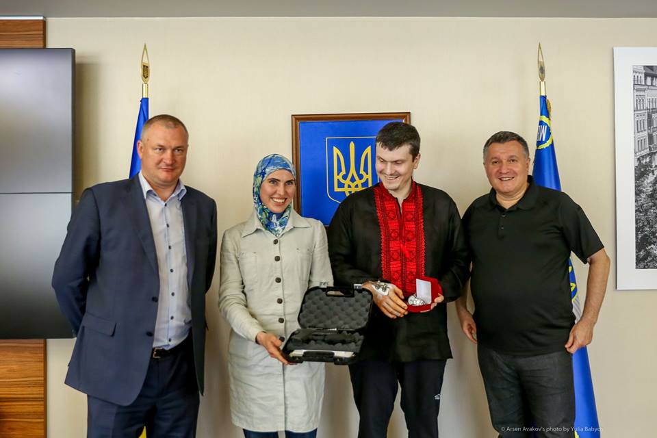 Министр внутренних дел Украины Арсен Аваков вручил известной АТОшнице Амине Окуевой, которая вместе с мужем Адамом Осмаевым пережила покушение, новый пистолет. Также глава МВД вручил Адаму Осмаеву часы.