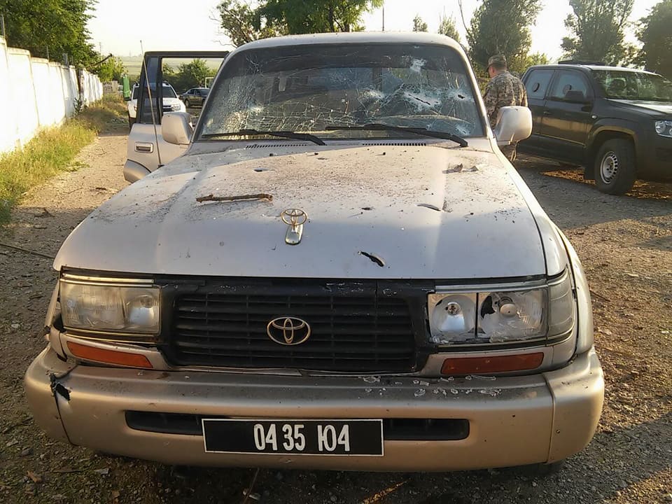 На опубликованных фото видно, что в результате обстрела серьезно пострадало одно из зданий и внедорожник.