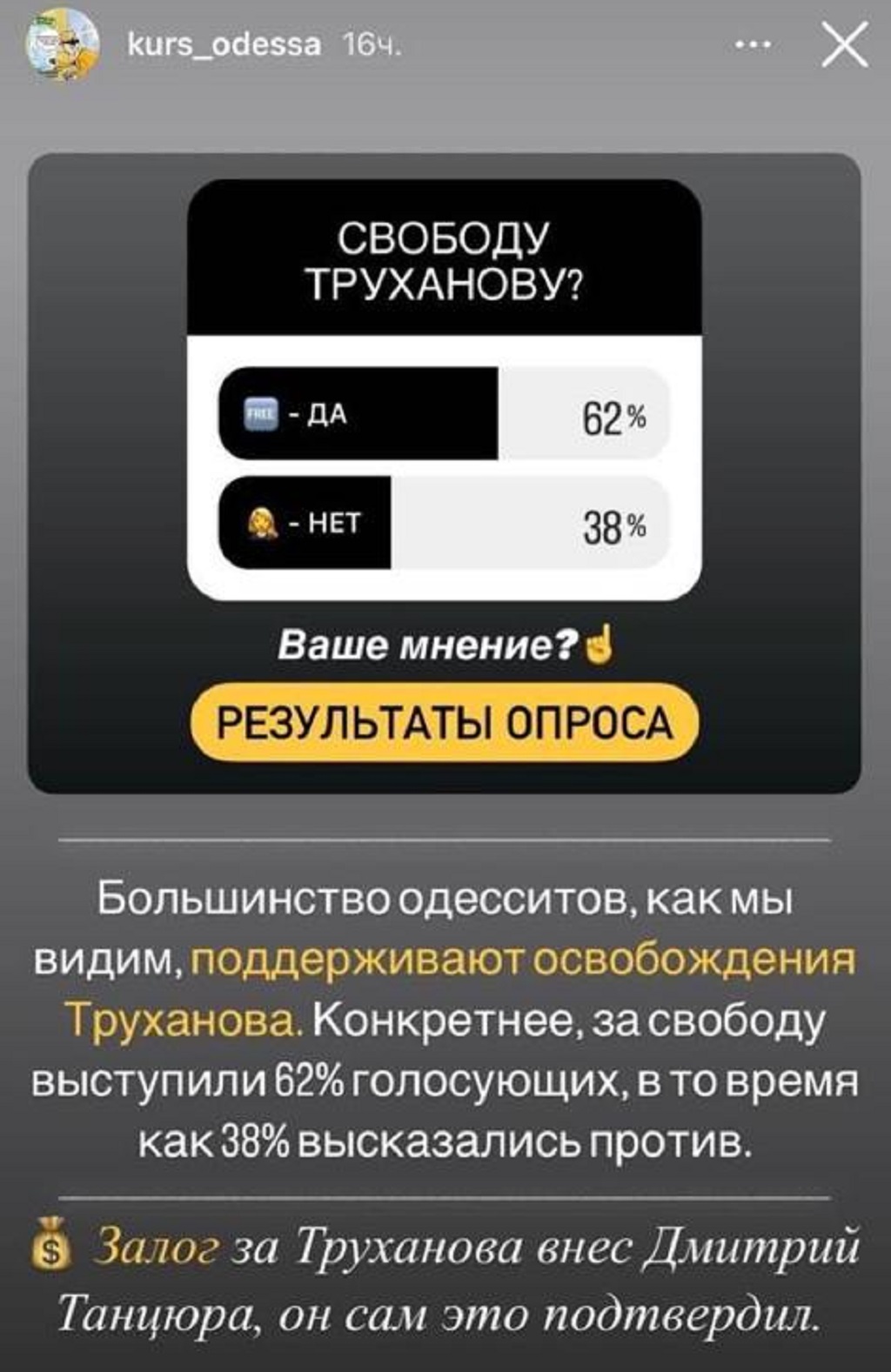 62% процента одесситов считают, что мэр Одессы Геннадий Труханов должен быть на свободе.