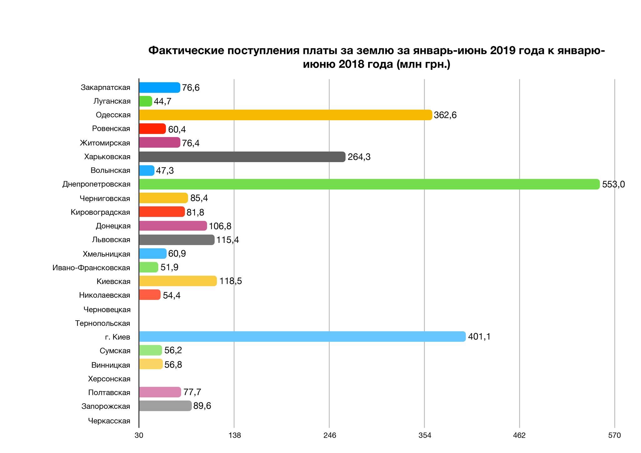 12 регионов обеспечили темп прироста платы за землю выше среднего по Украине (23,4%), больше 30% обеспечили 8 регионов.
