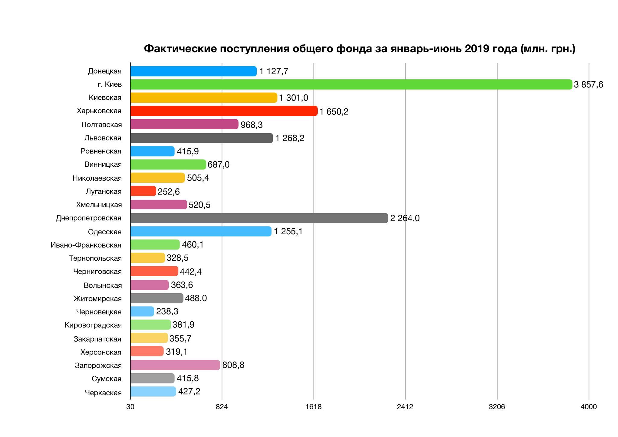 За январь-июнь текущего года в общий фонд местных бюджетов (без учета межбюджетных трансфертов) поступило 128 807,3 млн гривен. Прирост поступлений в общий фонд составил 19,6% или 21 103,0 млн гривен.