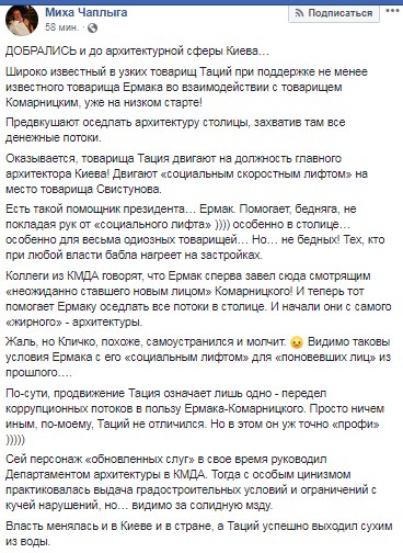 "Записной коррупционер Таций при поддержке Ермака и Комарницкого готовится подмять архитектурную сферу Киева, захватив в ней все денежные потоки. В частности, Тация двигают на должность главного архитектора вместо Свистунова. Такую информацию мне рассказали знающие люди в КГГА", – написал Миха Чаплыга.