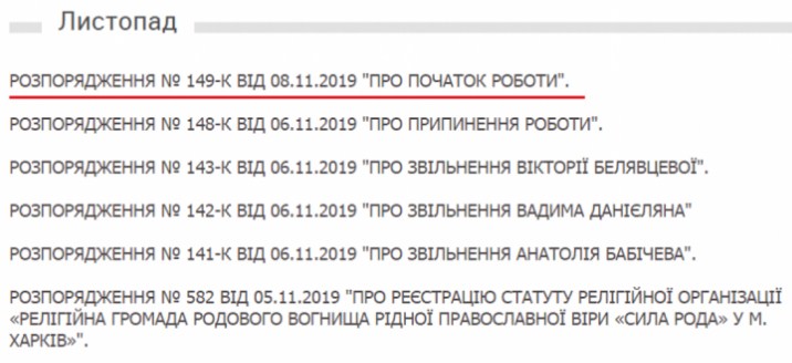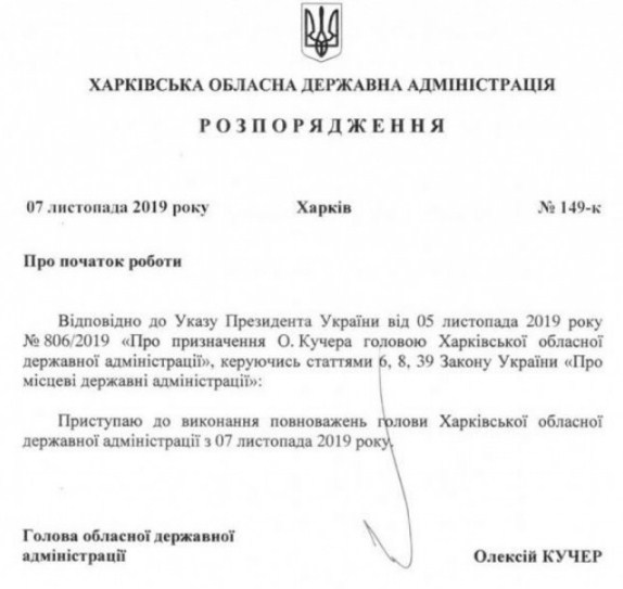 Как ранее сообщали СМИ, впервые распоряжение под номером, было опубликовано 7 ноября 2019 года. "Согласно Указу Президента Украины от 5 ноября ... приступаю к исполнению полномочий главы Харьковской областной государственной администрации с 7 ноября 2019 года", - было сказано в распоряжении №149-к от 7 ноября. Однако к 14:00 того же дня это распоряжение с сайта Харьковской обладминистрации исчезло. Вновь опубликовано оно было под тем же номером сутки спустя. В тексте появившегося была указана уже другая дата: 8 ноября 2019 года.