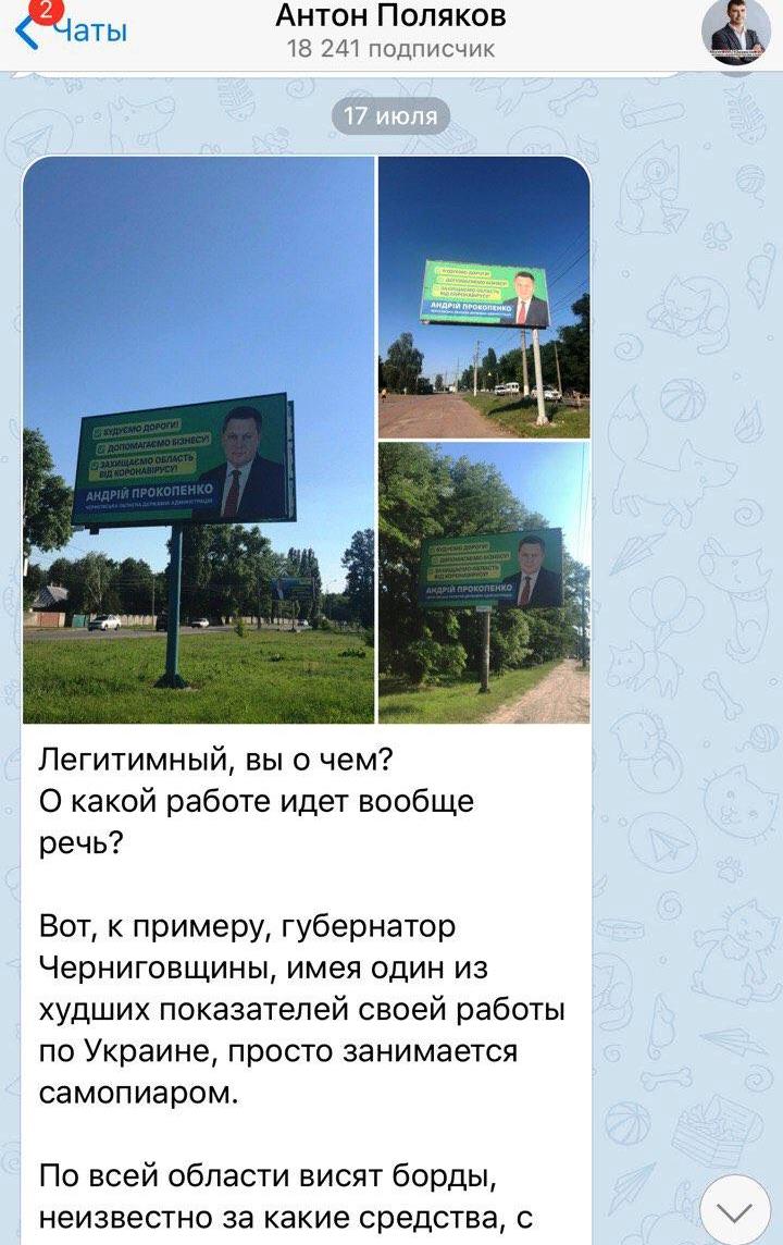 "Легитимный, вы о чем? О какой работе идет вообще речь? Вот, к примеру, губернатор Черниговщины, имея один из худших показателей своей работы по Украине, просто занимается самопиаром. По всей области висят борды, неизвестно за какие средства, с откровенным списком популизма "ни о чем". Кого защищает, где строит, как помогает никто из жителей Черниговщины не в курсе. Да, и если даже что-то из этого он бы сделал, то это бы получилось исключительно за бюджетные средства. То есть за счет налогоплательщиков. То есть чиновник возможно пиарится за счет освоенных кем-то бюджетных средств. ТерпиТЕ", - заметил Антон Поляков.