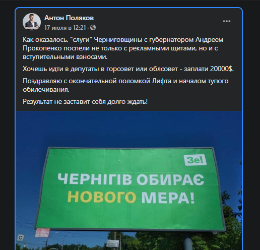 "Как оказалось, "слуги" Черниговщины с губернатором Андреем Прокопенко поспели не только с рекламными щитами, но и с вступительными взносами. Хочешь идти в депутаты в горсовет или облсовет - заплати 20000$", - заявил он.