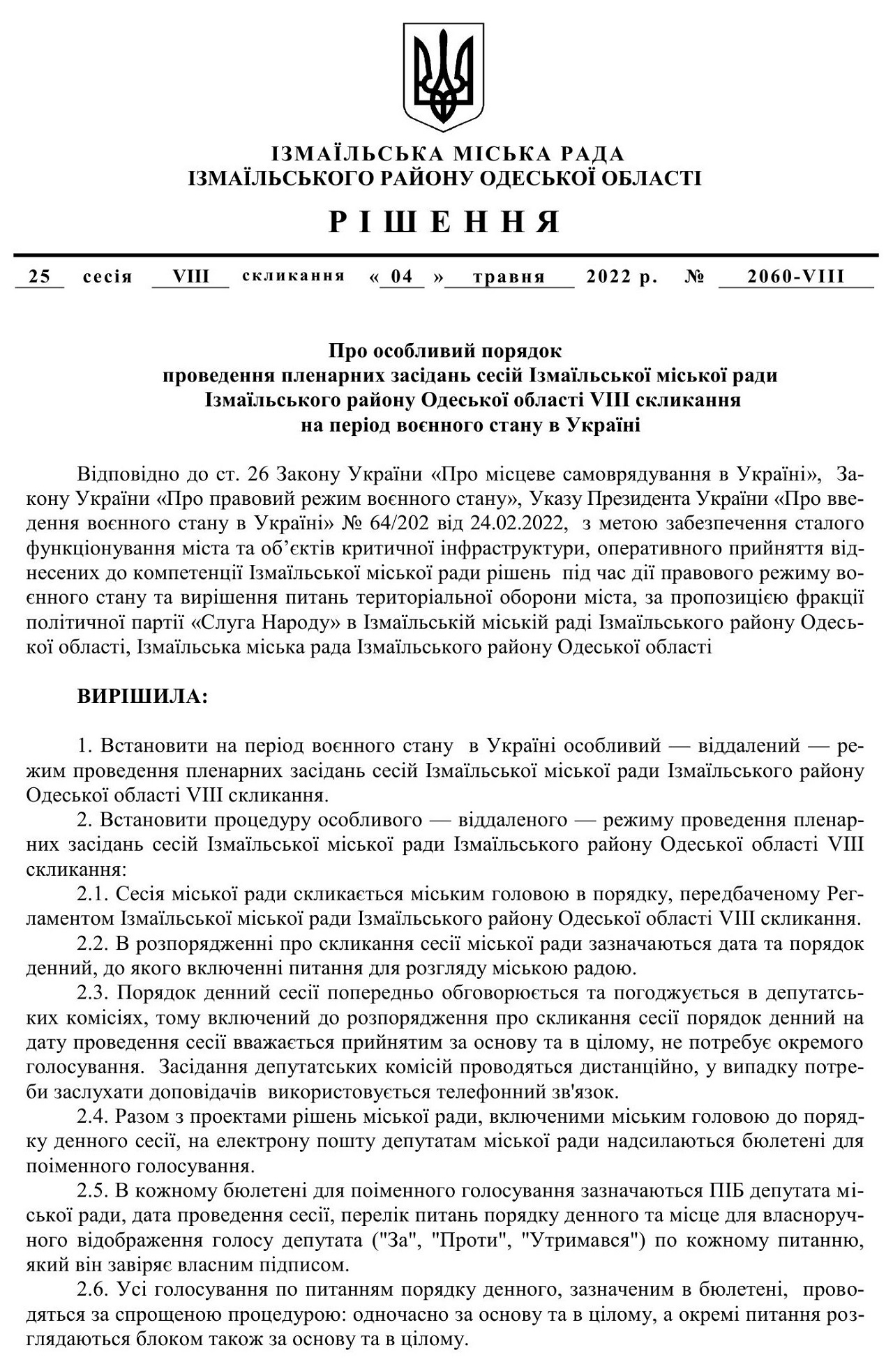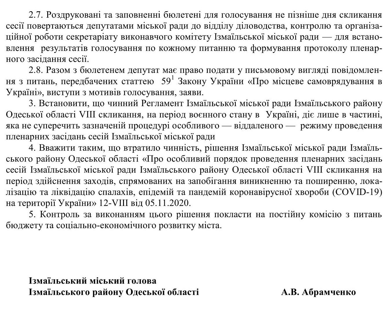Измаильский городской совет не работает так, как работают другие сельские, поселковые, городские советы в Украине, обращают внимание журналисты. Пленарные заседания здесь проводятся в особом отдаленном режиме. Такая форма пленарных заседаний не предусмотрена законодательством, Измаильский горсовет сам себе его установил на период военного положения - на 25-й сессии 4 мая 2022 решением №2060-VIII. Депутаты лишили себя права формировать повестку дня сессии, которую за них формирует Измаильский городской голова Андрей Абрамченко.