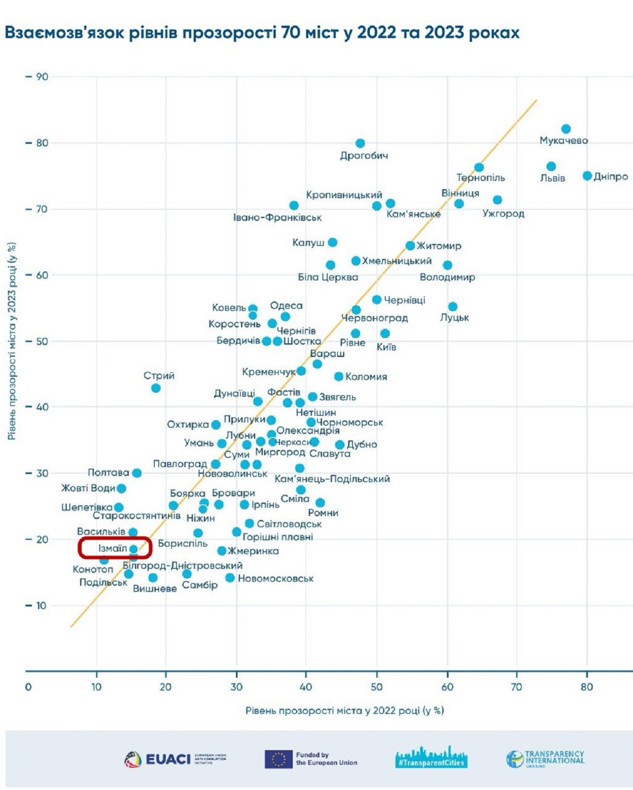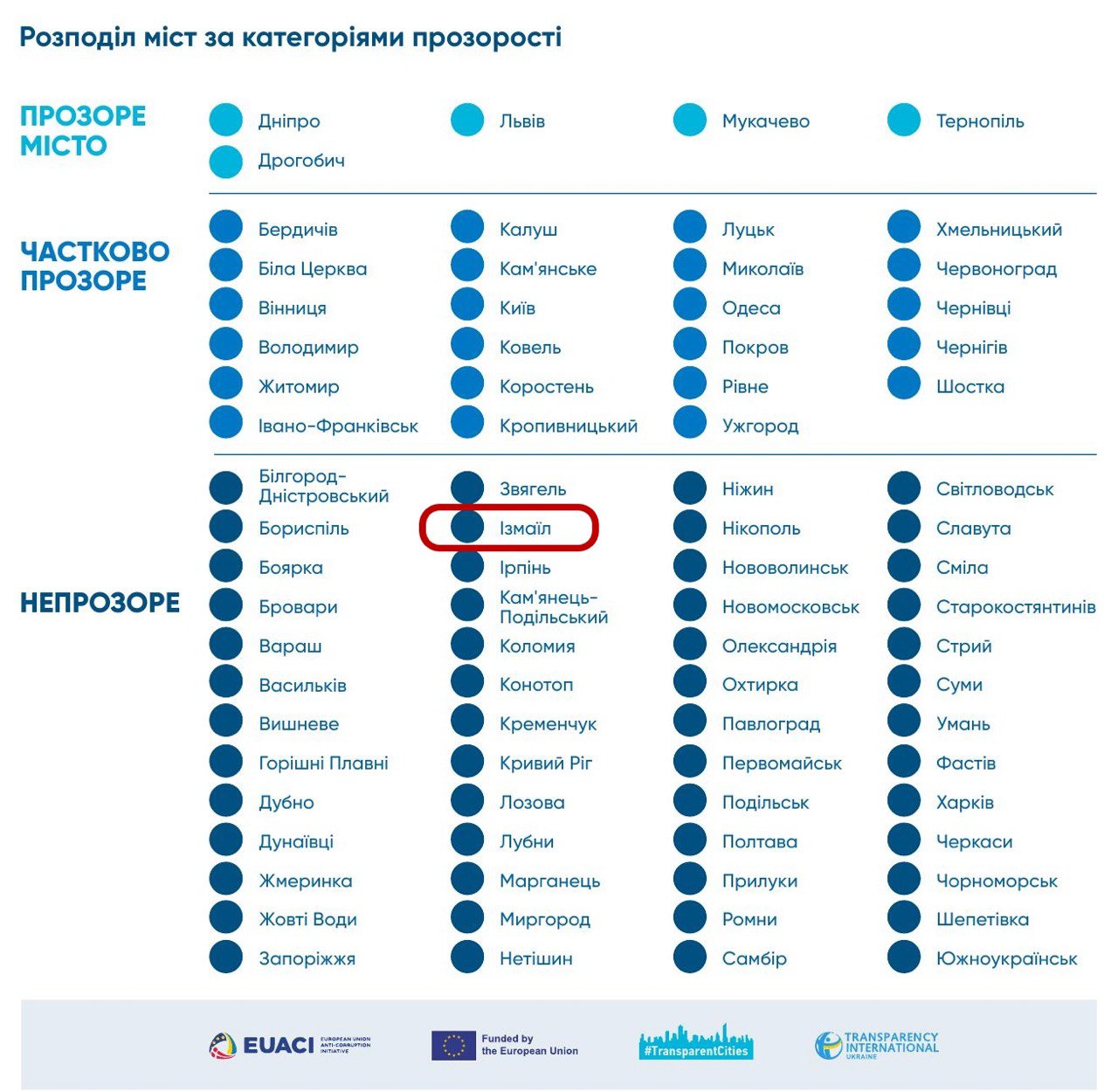 Программа "Transparent cities/Прозрачные города" проанализировала деятельность муниципалитетов в 80 крупнейших городах Украины. И, согласно результатам исследования, Измаил под руководством городского головы Андрея Абрамченко в очередной раз попал в категорию непрозрачных городов. Анализировалось 50 индикаторов, касающихся организации работы городских советов на время действия военного положения, публикации информации на официальных ресурсах, обеспечение доступа к данным о земельных и жилищных вопросах, коммунальном имуществе, социальной сфере и т.д. Отдельные индикаторы касаются создания возможностей для ВПЛ и релоцированного бизнеса, обнародования информации о полученной гуманитарной помощи, расположении укрытий, предоставлении компенсаций за разрушенное или поврежденное имущество.