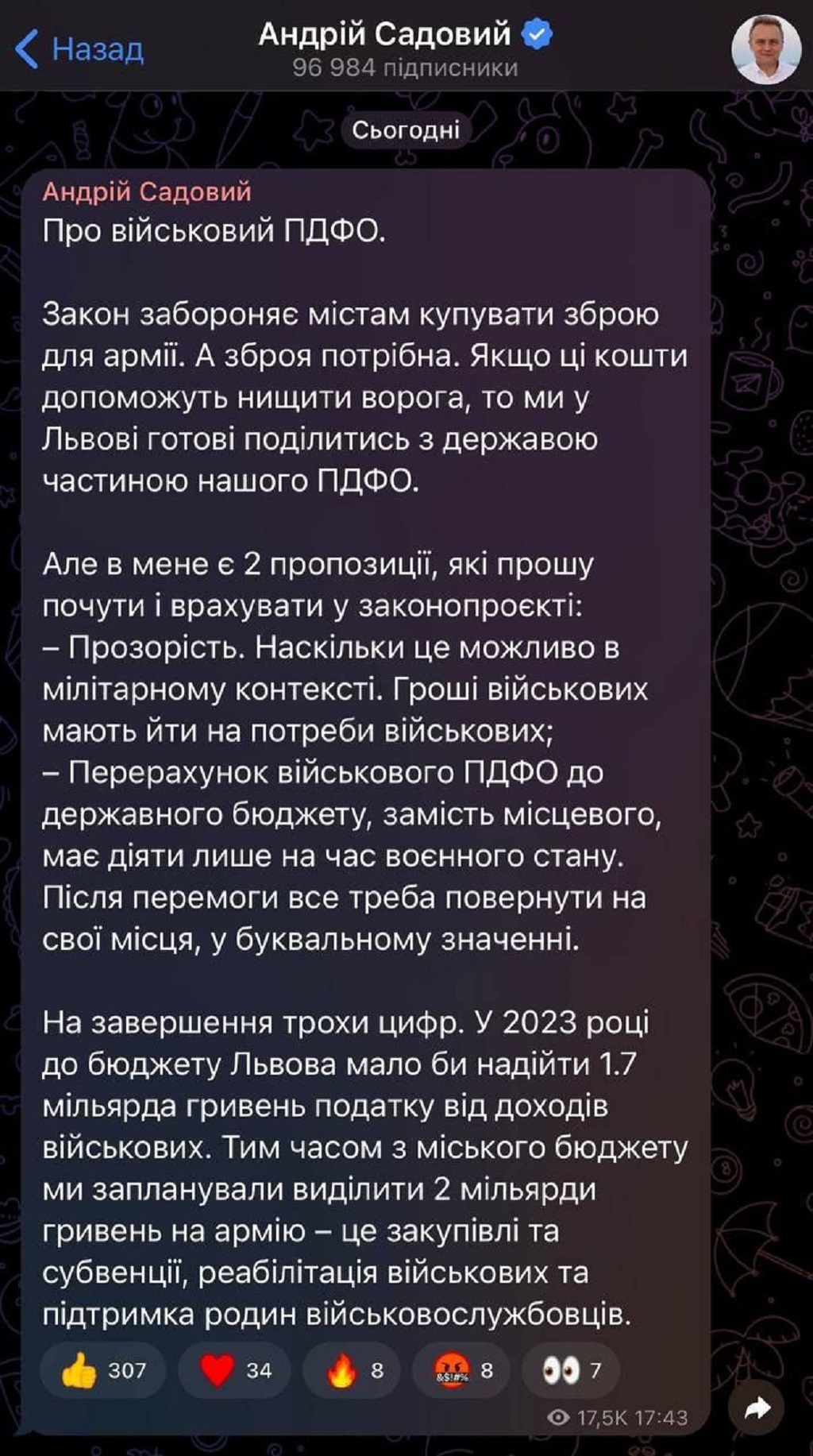 "Городской голова опубликовал пост, где сообщил, что из городского бюджета он планировал выделить 2 миллиарда гривен на армию. И вообще Львов готов поделиться с государством частью НДФЛ, если эти средства помогут уничтожать врага", – написал депутат.