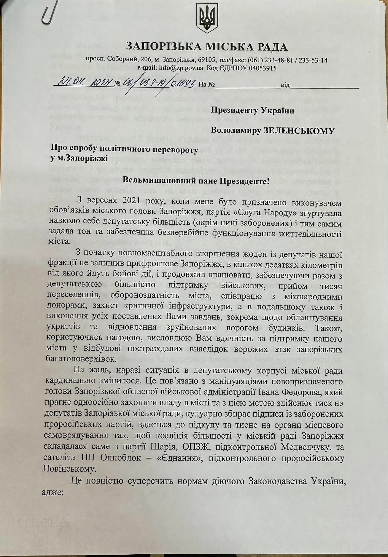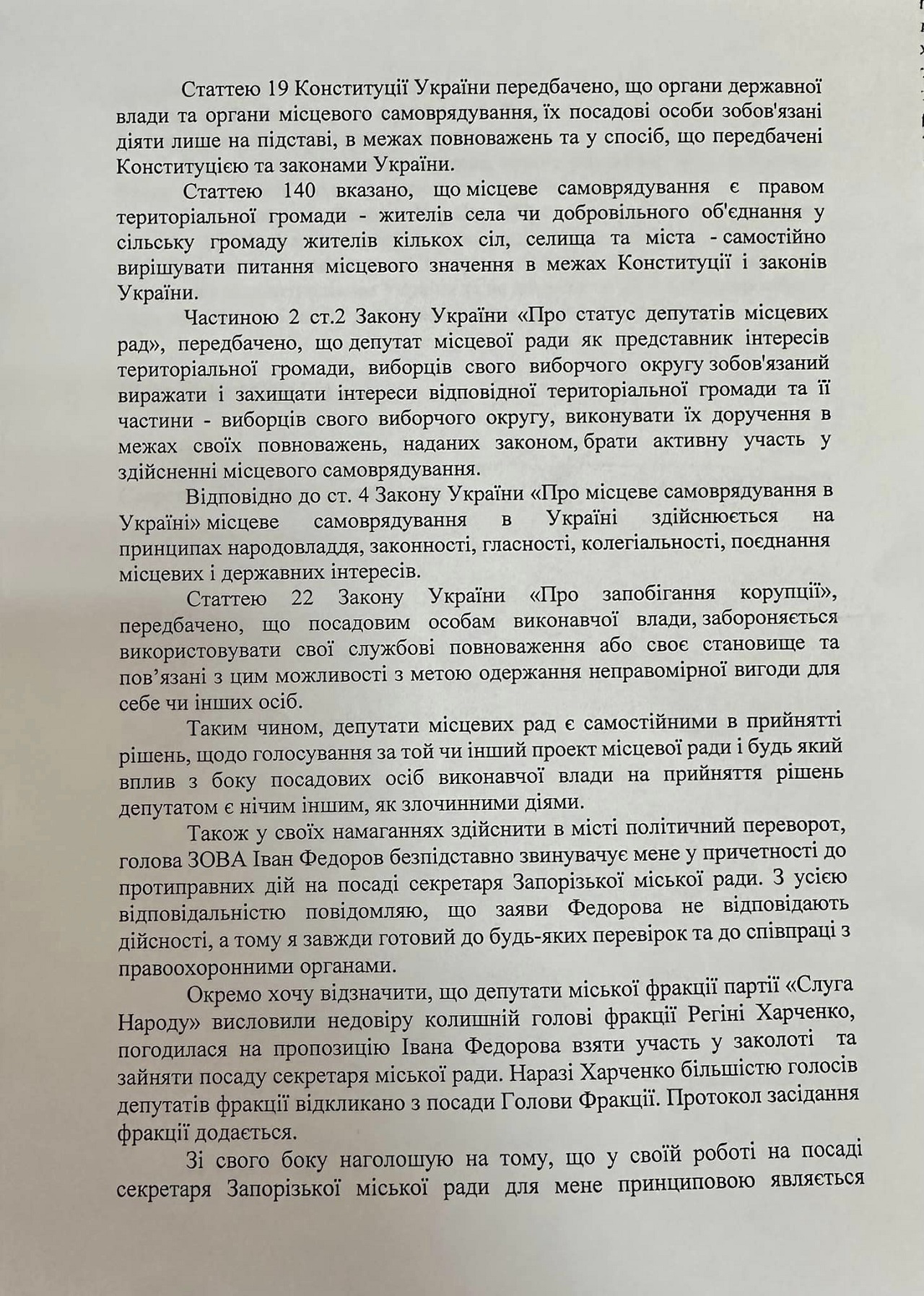 К сожалению, ситуация в депутатском корпусе городского совета кардинально изменилась. Это связано с манипуляциями новоназначенного председателя Запорожской областной военной администрации Ивана Федорова, который стремится единолично захватить власть в городе и с этой целью оказывает давление на депутатов Запорожского городского совета, кулуарно собирает подписи с запрещенных пророссийских партий, прибегает к подкупу и давит на местное самоуправление так, чтобы коалиция большинства в городском совете Запорожья состояла именно из партии Шария, ОПЗЖ, подконтрольной Медведчуку, и сателлита ПИ Оппоблок – "Единение", подконтрольного пророссийскому Новинскому. Это полностью противоречит нормам действующего Законодательства Украины".