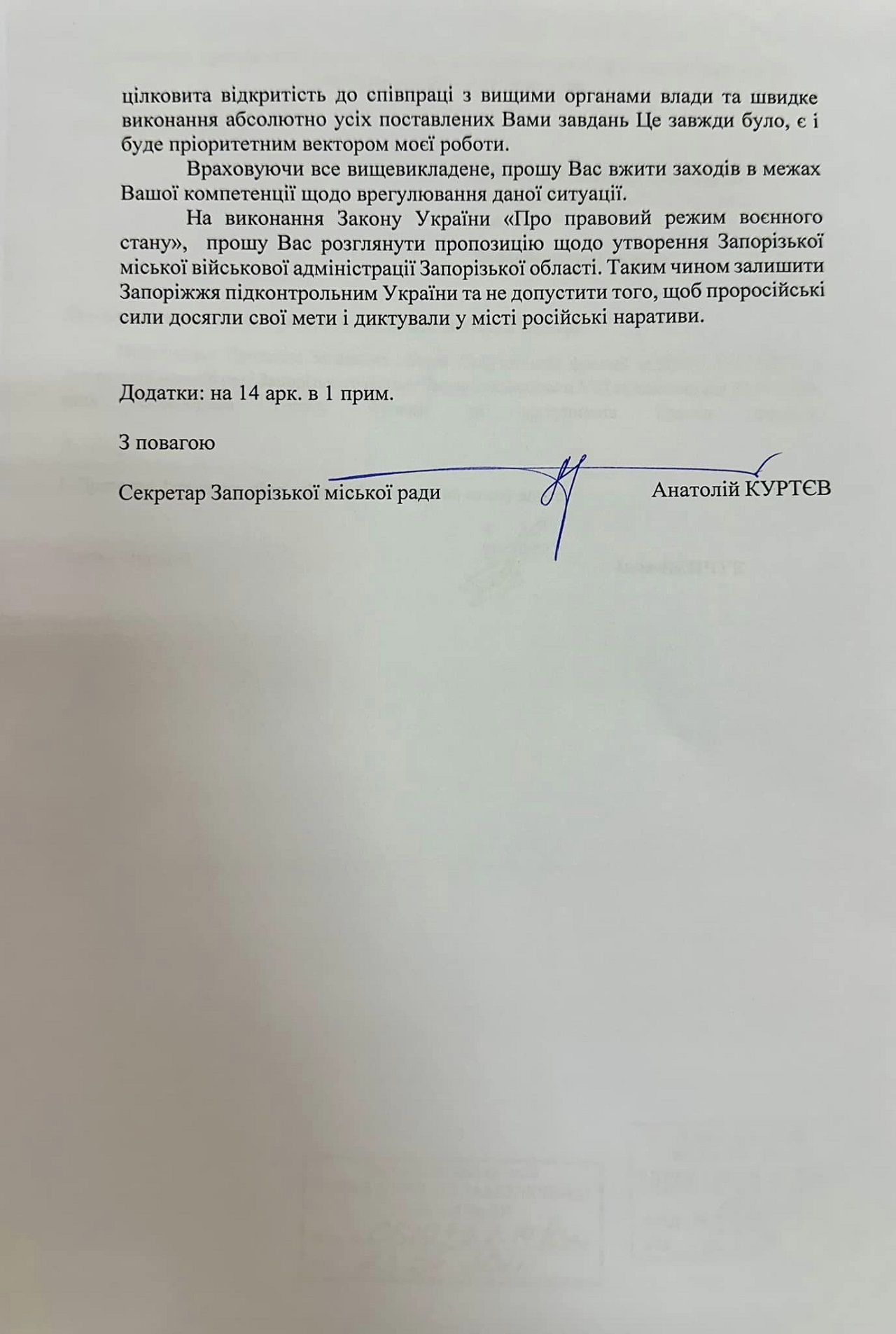 В Фейсбуке Анатолий Куртев опубликовал фото полного текста обращения к Президенту о "попытке политического переворота в г. Запорожье".