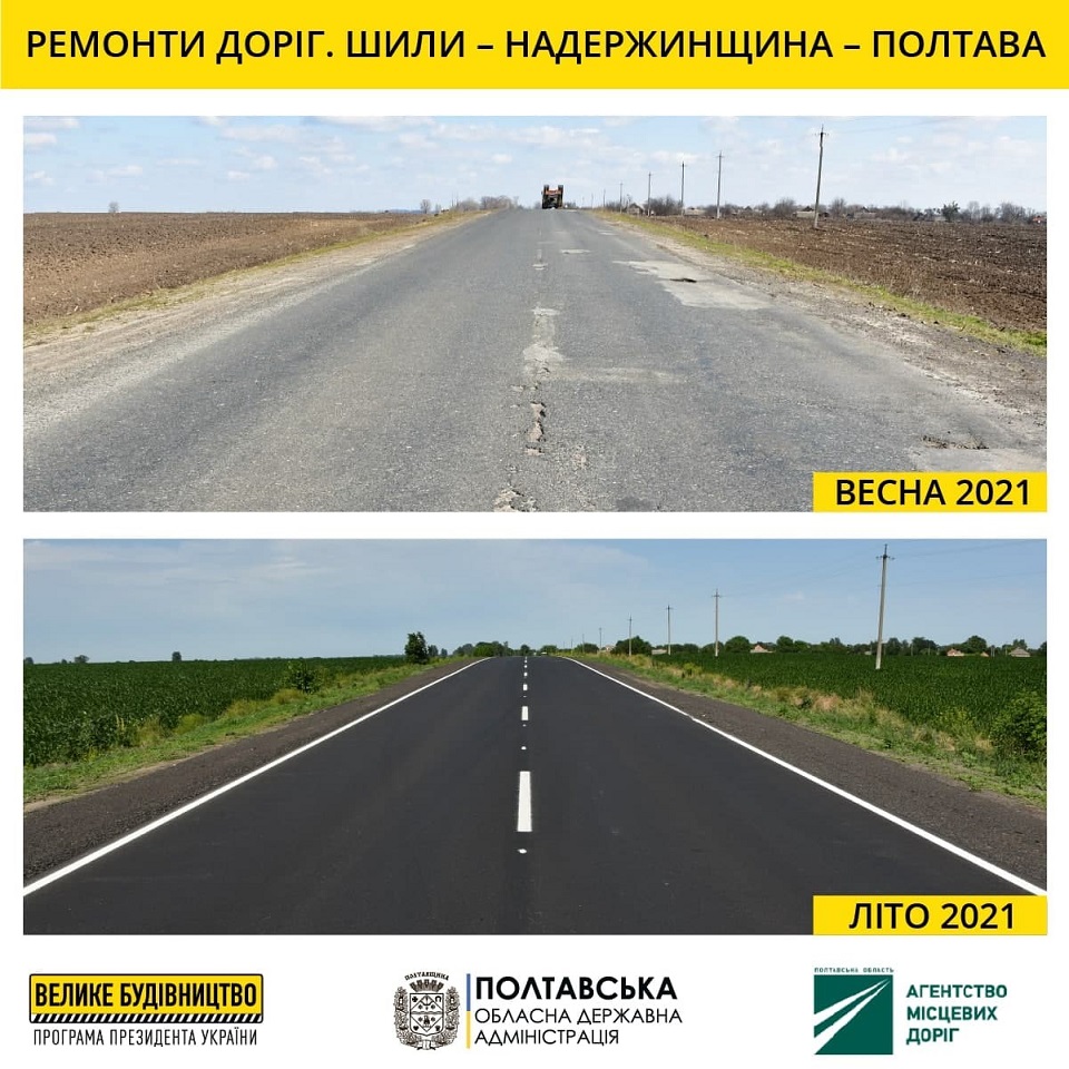 "За два года подрядчики Агентства местных дорог полностью отремонтировали дорогу Шилы - Надержинщина - Полтава по всей протяженности. В этом году отремонтировали почти 4 километра дороги. Всего сплошным асфальтобетоном покрыто почти 10 километров автодороги", - поделился подробностями глава Полтавской ОГА Олег Синегубов.